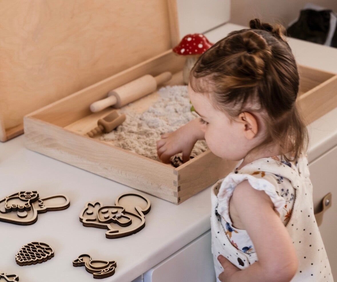 Deze houten speelbak is een topper. Als je hem met kinetisch zand of speelrijst vult, spelen de kinderen erop los. Na een dag vol prikkels is het heerlijk spelen met dit sensorische speelmateriaal. Het geeft een rustgevend gevoel als het door de handjes gaat. Een kinder deegroller, stempels, vultrays, een kommetje en een schepje maken het feest compleet. Lekker de fantasie erop los laten gaan.