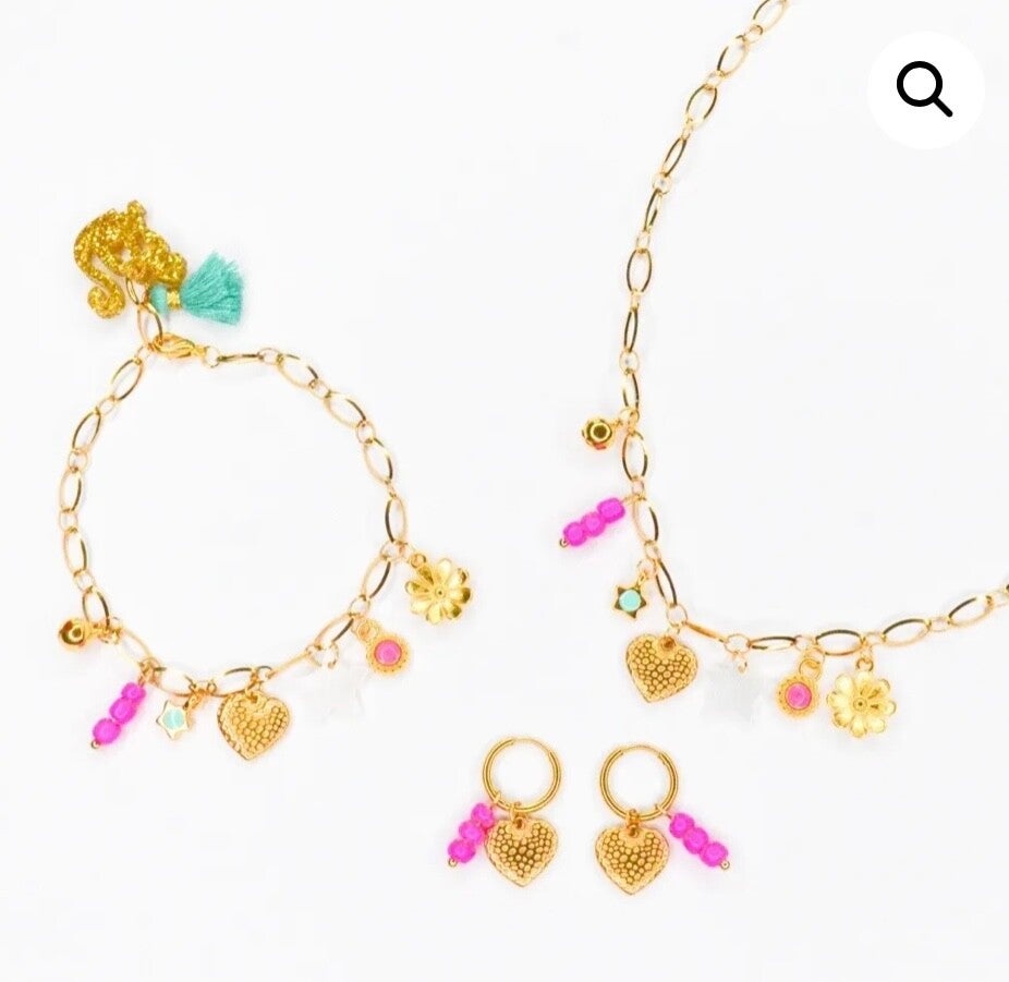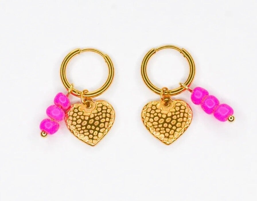 In het middelpunt van deze betoverende oorbellen schittert een goudkleurig hartje, wat een liefdevolle en stijlvolle touch toevoegt. Verder versierd met delicate roze kraaltjes, stralen deze oorbellen een subtiel gevoel van jeugdige charme uit.