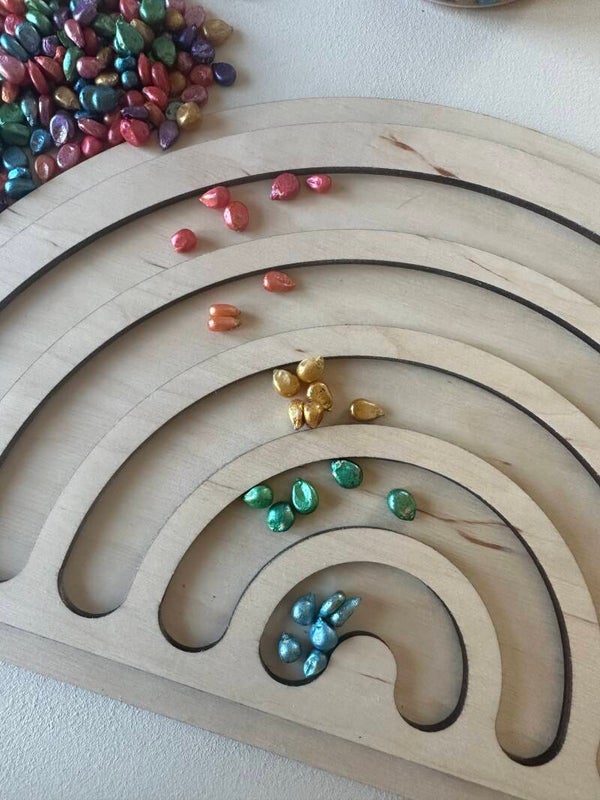 Vulvorm of speeltray in de vorm van een regenboog. Perfect te vullen met droge items zoals speelrijst / speelparels. Ook leuk om als watermeloen te vullen met de kleuren groen/rood en zwart.