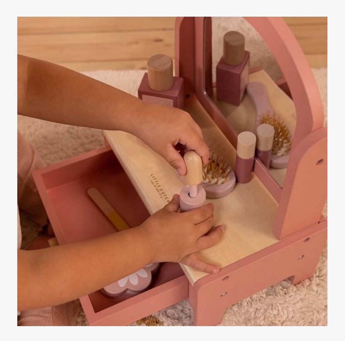Spiegeltje, spiegeltje aan de wand. Deze roze houten kaptafel voor kinderen stimuleert fantasierijk spel en zorgt voor eindeloos veel speelplezier. De kaptafel beschikt over een draaiende spiegel en 6 houten schoonheidsproducten, zoals een haarborstel, lippenstift, parfum, oogschaduw, nagelvijl en nagellak. De kaptafel heeft ook een opberglade om haarbanden, elastiekjes en speldjes (niet inbegrepen) in te bewaren. Geschikt vanaf 3 jaar.