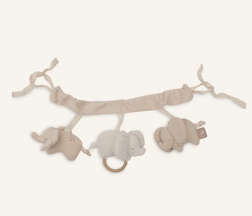 Deze vrolijke wagenspanner is versierd met drie schattige olifantjes, elk met een uniek ontwerp. Er is een velours olifant in wit, een olifant van ribstof, en een effen olifantje met schattige ruit patroon oren. De olifantjes zijn met elkaar verbonden en kunnen gemakkelijk aan de kinderwagen bevestigd worden. Ideaal voor onderweg!