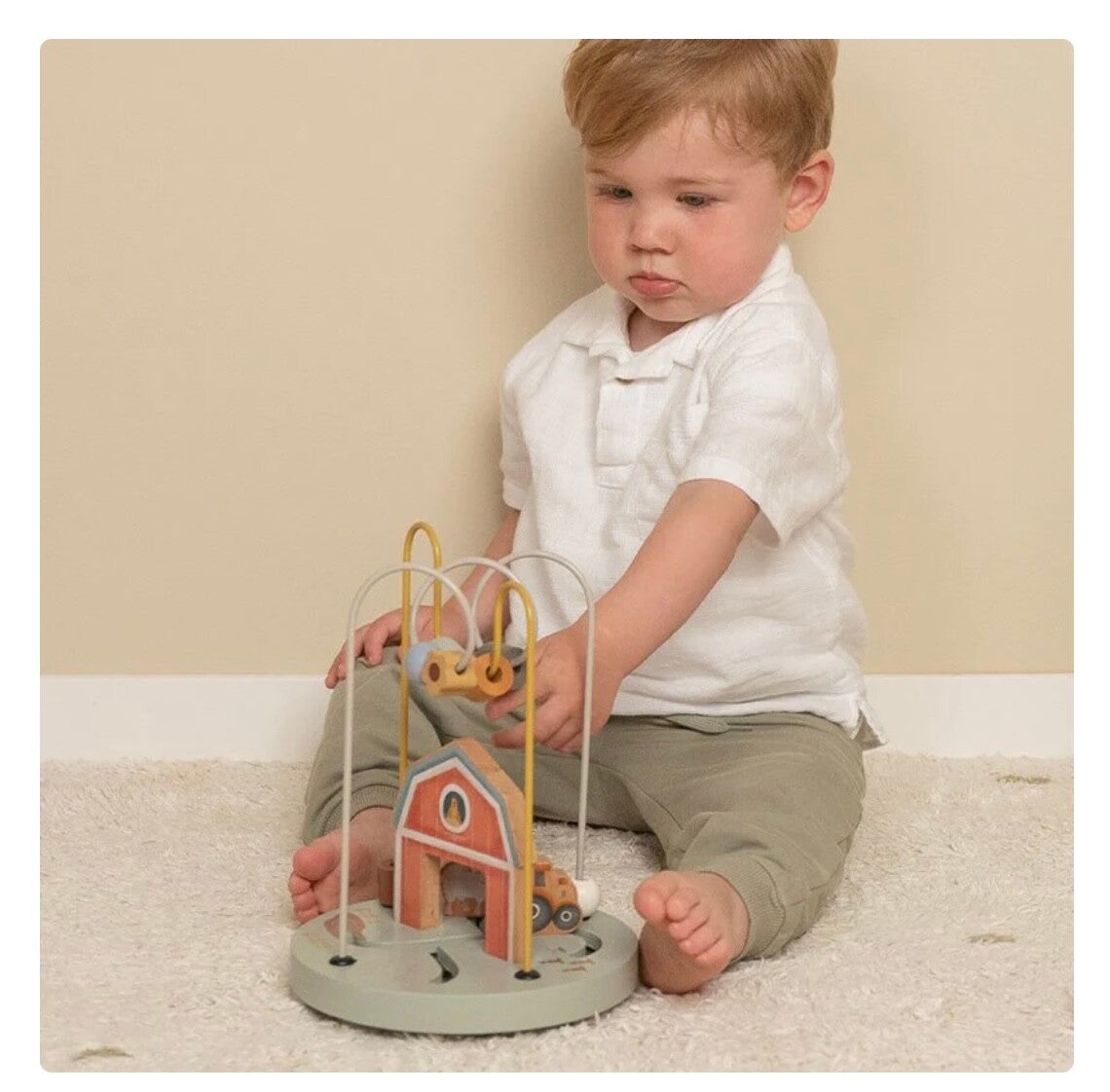Deze houten activiteitenspiraal in boerderij thema biedt een leerzame activiteit voor jouw kindje. Breng de blokjes, de tractor, het varkentje en het schaap van de ene naar de andere kant! Speelplezier gegarandeerd.