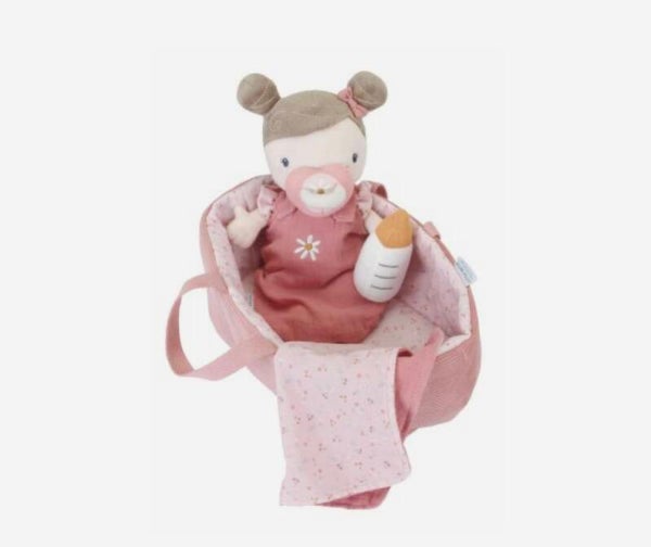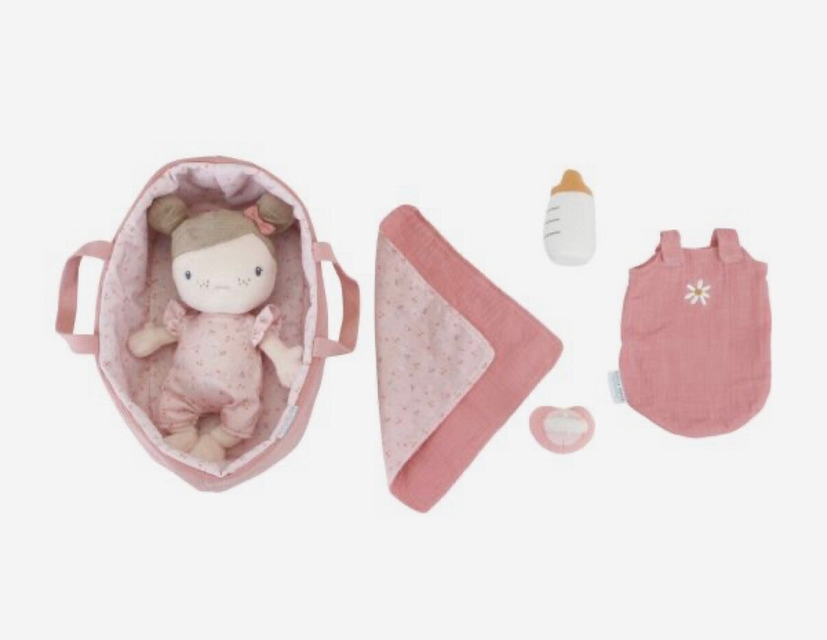 De Little Dutch Little Pink Flowers Babypop - Rosa is een vrolijke pop waar je kindje uren mee kan spelen en knuffelen. Je kindje kan net als papa en mama de fles of de fopspeen geven, een slaapzakje aantrekken, zijn luier verschonen, of Rosa heerlijk onder het dekentje leggen. Babypop Rosa is ook gemakkelijk mee te nemen in het leuke poppenwiegje wat wordt meegeleverd. Verder is de babypop gemaakt van heerlijk zacht materiaal en geschikt voor kinderen vanaf 1 jaar.